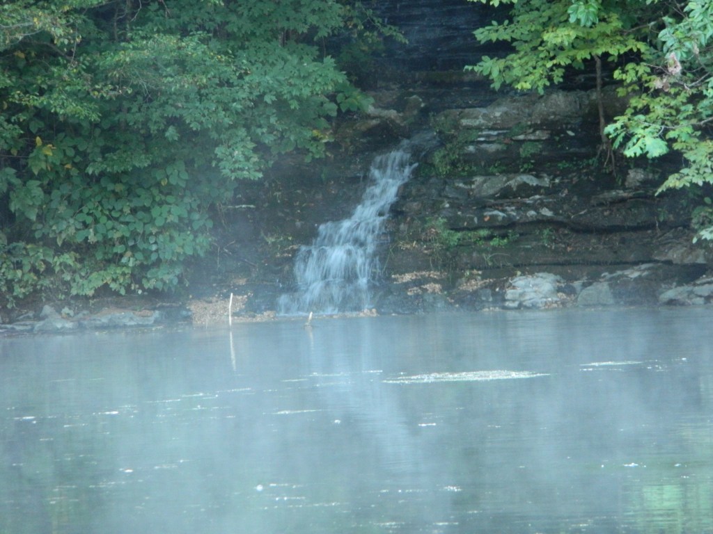 Adding to my nervousness of being so far out in a new area with new boat equipment was the fact that in the early morning light, visibility was not great due to large patches of misty fog hanging over the lake. But the mist was making some interesting patterns over the water and since we were apparently no closer to fishing, I pulled out my camera to play around with video and try to capture the effect of the mist that looked like it was coming up out of the water in spikes. It was because of this that I managed to capture our discovery of what we very originally dubbed “Waterfall Cove”.