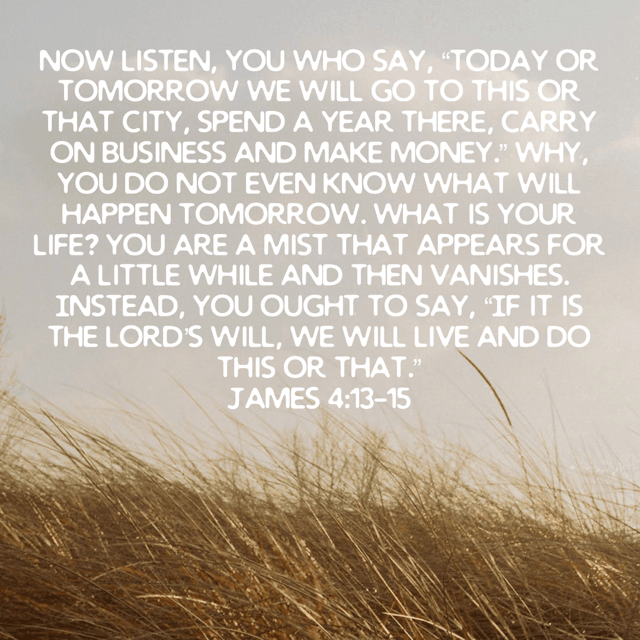 “Now listen, you who say, “Today or tomorrow we will go to this or that city, spend a year there, carry on business and make money.” Why, you do not even know what will happen tomorrow. What is your life? You are a mist that appears for a little while and then vanishes. Instead, you ought to say, “If it is the Lord’s will, we will live and do this or that.”
