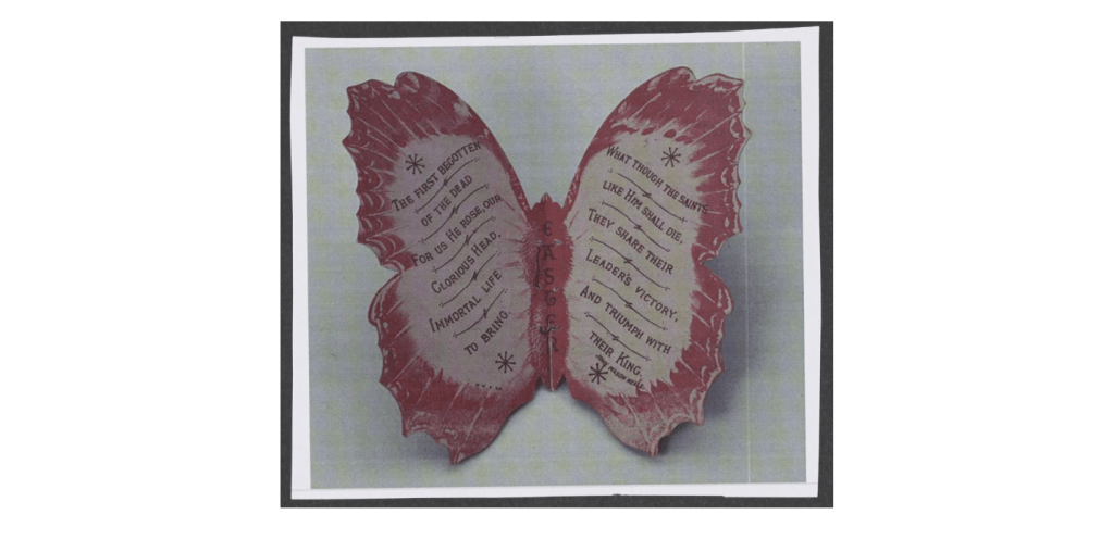 His cardboard butterfly has its own interesting story. The cardboard prop was tucked into one of his notebooks that was donated to the library of congress in 1918. Following the attack on Pearl Harbor in 1942, the Library of Congress shipped many of its most valuable holdings to various locations for safe keeping and Walt Whitman’s notebooks were sent to Ohio. After the war, the crate with his notebooks was sent back to Washington, but when it was opened, it was discovered that several notebooks were missing, including the one with the cardboard butterfly.